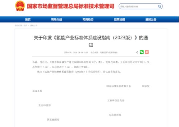 8月8日,國家標準化管理委員會、國家發展和改革委員會、工業和信息化部等六部門聯合印發《氫能產業標準體系建設指南(2023版)》,這是國家層面首個氫能全產業鏈標準體系建設指南。